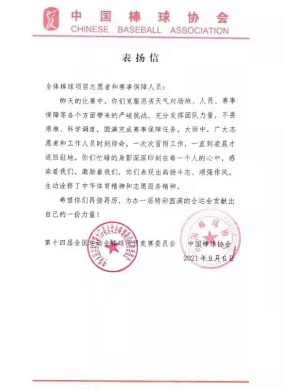 中国棒球协会向棒球项目志愿者和赛事保障人员送来表扬信