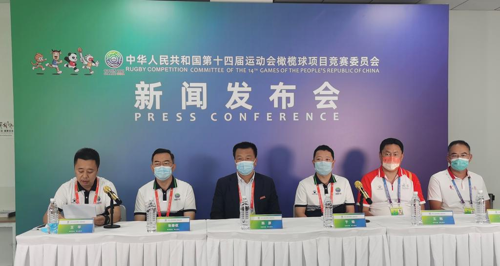 本网讯 9月15日下午,第十四届全国运动会橄榄球项目赛前新闻发布会在我校鄠邑校区橄榄球场召开。中国橄榄球协会代理秘书长张春权,橄榄球项目竞委会执行主任、西安体育学院副校长陈彦,中国橄榄球协会竞训部部长、橄榄球项目竞委会副主任于晗,东道主陕西女子橄榄球队领队王刚、上届全运会冠军队山东队橄榄球队代表于晓东。出席发布会。会议由十四运会橄榄球项目媒体及广播电视协调处处长王平主持。