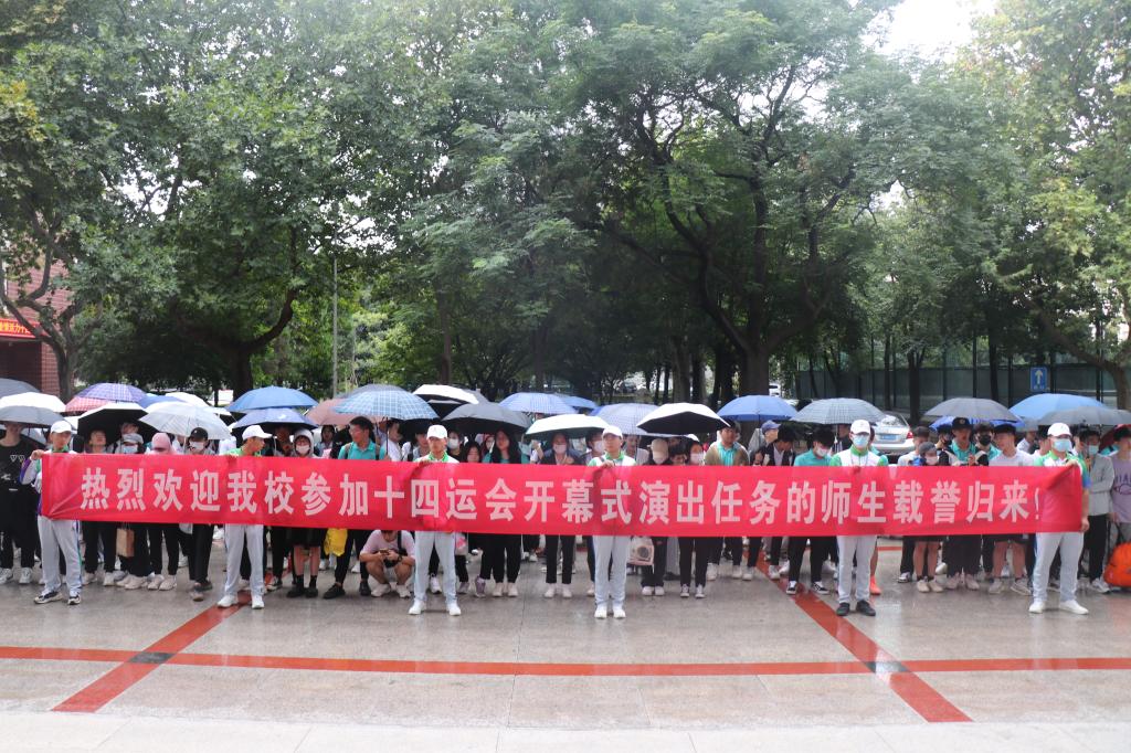 本网讯 9月16日下午,我校在田径综合馆前举行隆重欢迎仪式,迎接参与十四运会开幕式演出师生载誉归来。校党委书记黄道峻,校长刘子实,党委副书记文立新,党委委员、党委宣传(统战)部部长张朝阳及相关职能部门领导出席欢迎仪式。