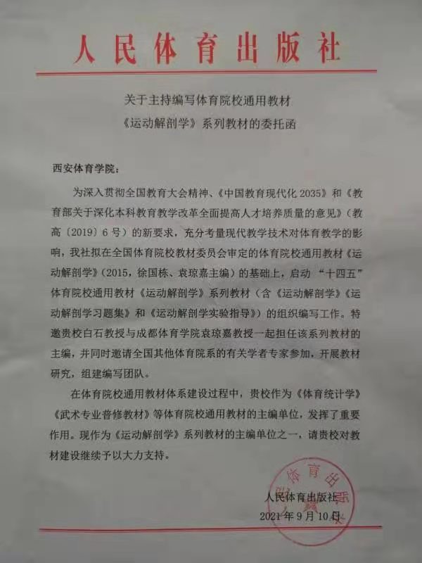 据悉,为深入贯彻全国教育大会精神、《中国教育现代化2035》和《教育部关于深化本科教育教学改革全面提高人才培养质量的意见》(教高(2019)6号)的新要求,充分考量现代教学技术对体育教学的影响,人民体育出版社启动“十四五”体育院校通用教材《运动解剖学》系列教材(含《运动解剖学》《运动解剖学习题集》和《运动解剖学实验指导》)的组织编写工作。委托函中还对我校多年来在体育通用教材体系建设过程中,作为《体育统计学》《武术专业普修教材》等体育院校通用教材的主编单位发挥的重要作用表示感谢。