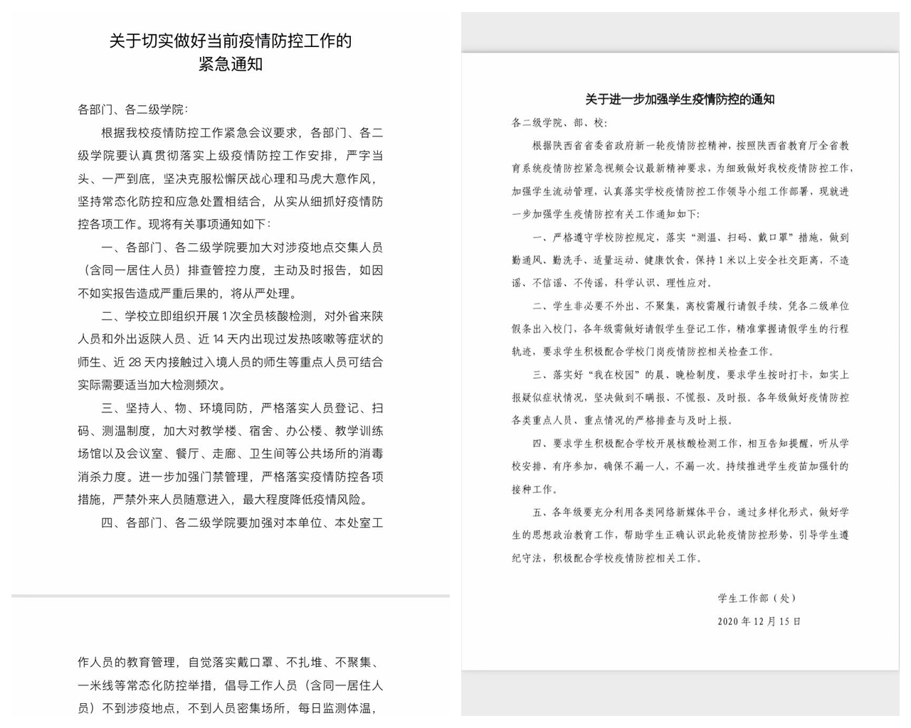 学校疫情防控工作领导小组、学工部、教务处等单位先后发布《关于切实做好当前疫情防控工作的紧急通知》、《关于进一步加强学生疫情防控的通知》、《关于进一步加强疫情防控、教育教学等相关工作的紧急通知》、《关于做好疫情防控期间鄠邑校区本科生线上教学工作的通知》、《关于做好疫情防控期间含光校区本科生线上教学工作的通知》等。