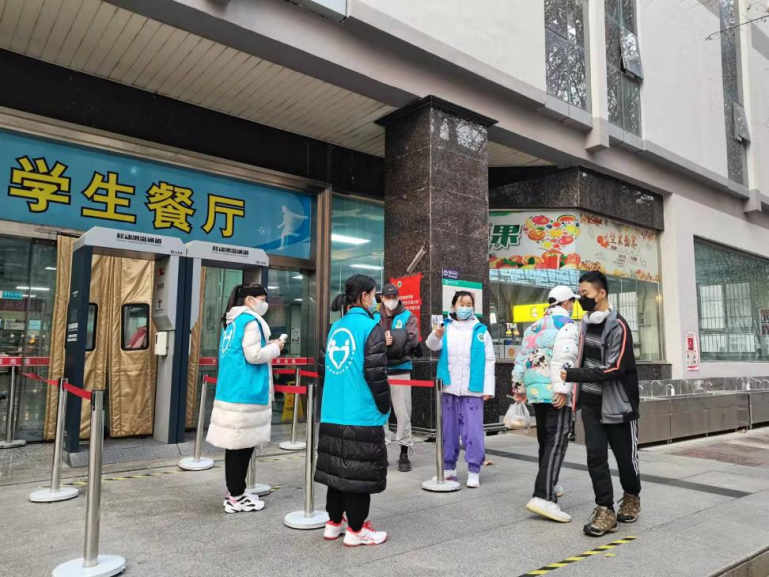 在餐厅前,也能看到这些最美的逆行者,他们轮流值班测量每一名进出餐厅同学的体温并进行酒精消毒,一站就是5-6个小时,双手被寒风吹得红肿,但没有一个人喊苦喊累,为切实打赢疫情防控阻击战贡献力量,发扬党员先锋模范作用,做到招之能来,来之能战,用实际行动彰显尽职、奉献、有担当的风范。