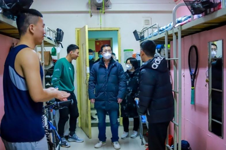 自我校封校和学生宿舍实施封闭管理以来,体育教育学院严格执行我校有关防疫政策,积极组织学生在宿舍开展线上学习、思政大课堂、防疫知识宣传、心理健康教育、体育锻炼等活动。高月宏一行叮嘱同学们听从学校安排,严格执行疫情防控相关制度,注重劳逸结合,在学习之余坚持体育锻炼,督促学生按时作息,认真做好线上学习,确保线上学习学有成效。看到学生在宿舍内锻炼,高月宏和同学们一起举起哑铃,互相交流切磋。
