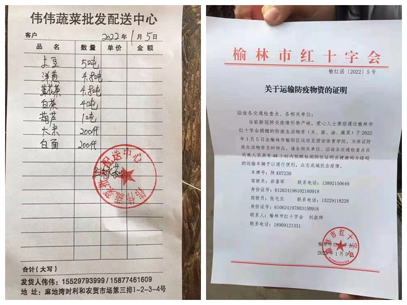 ✮1月6日,安康市石泉县人民政府积极支援我校,经过紧张筹备,捐赠洋葱2000斤、土豆1800斤、红萝卜1800斤、莲菜1500斤、青笋1000斤、白菜1000斤、包菜2000斤、西红柿600斤、白萝卜1000斤、蒜苔600斤、塌辣子200瓶、饼子馍200个、50箱鸡蛋1500个、100袋大米共1000斤、100袋面粉共1000斤、48桶油480斤防疫生活物资,表达了石泉人民对我校师生的关爱之情。