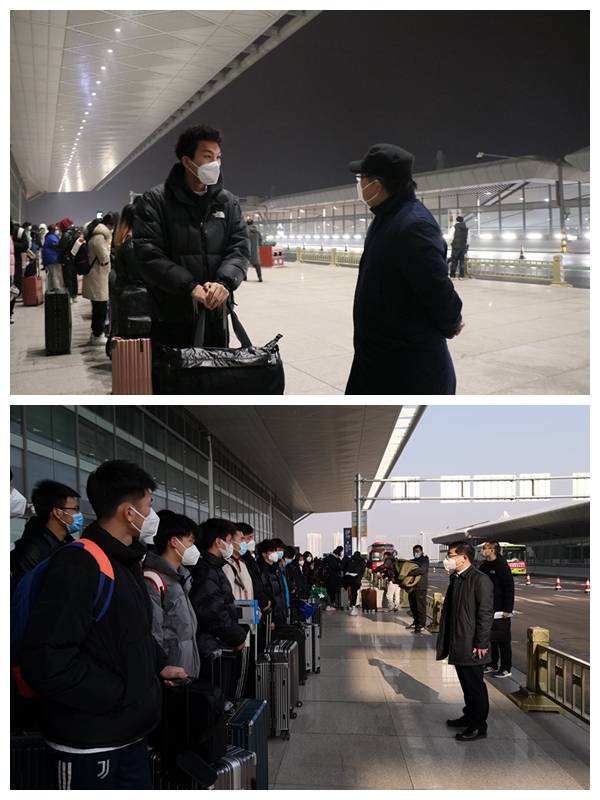 这次回家最惊喜的就是学校包车送站,领导、老师和志愿者们冒着寒风在校内集合地点组织学生上车,而在我们到达车站之前,还有很多人在忙前忙后,大巴去往车站的时间最早甚至在凌晨,志愿者们三班倒,颠倒作息,在集合地点清点人数,组织纪律,班干部,导员同样也在帮忙,提醒同学勿忘时间,回家迅速填写名单,报备地点。学校、学院领导和教研室老师们随车护送,并在进站前叮嘱我们要保管好证件,路上做好防疫,一定要注意安全。