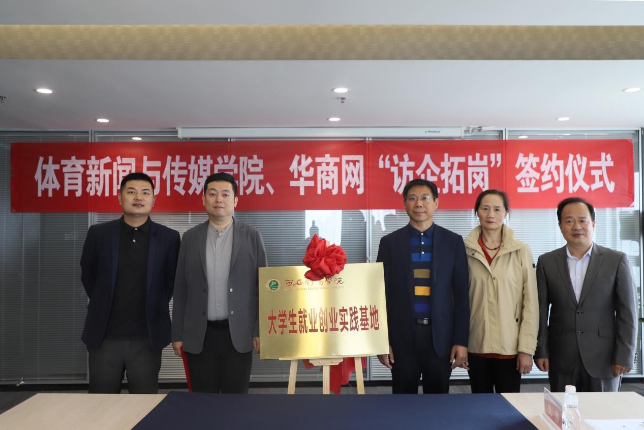 校党委副书记文立新与华商网总经理、总编辑任坤共同为我校大学生就业创业实践基地揭牌。体育新闻与传媒学院院长马增强、华商网常务副总经理蔡珂代表双方签署协议。双方相关负责人共同参加签约仪式。