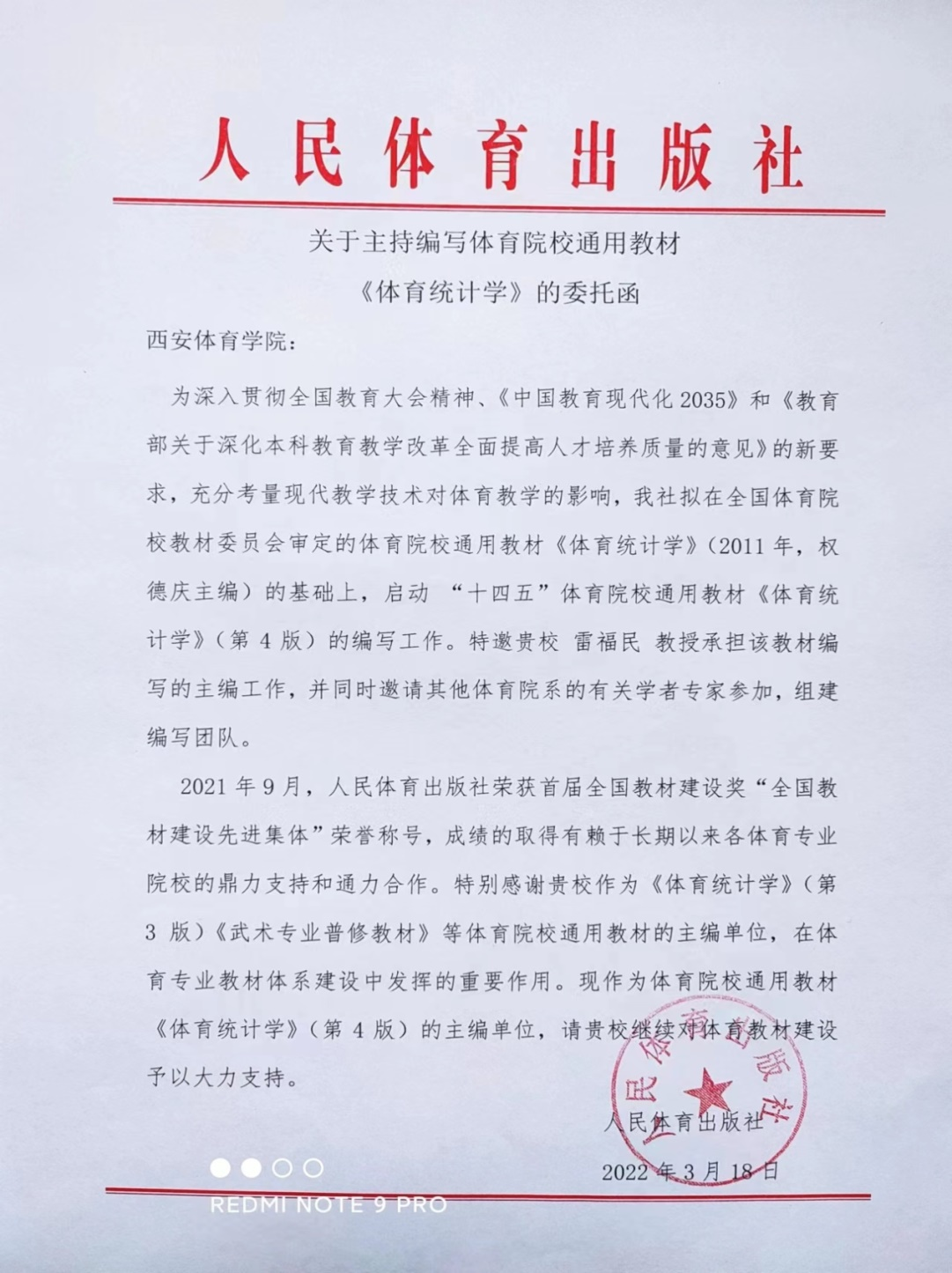 本网讯 近日,人民体育出版社发来关于主持编写体育院校通用教材《体育统计学》教材的委托函,特邀我校雷福民教授承担该教材编写的主编工作,我校为主编单位之一。此为我校“十四五”规划与统编类教材建设的又一重大突破,标志着我校教材建设迈上了一个新台阶。