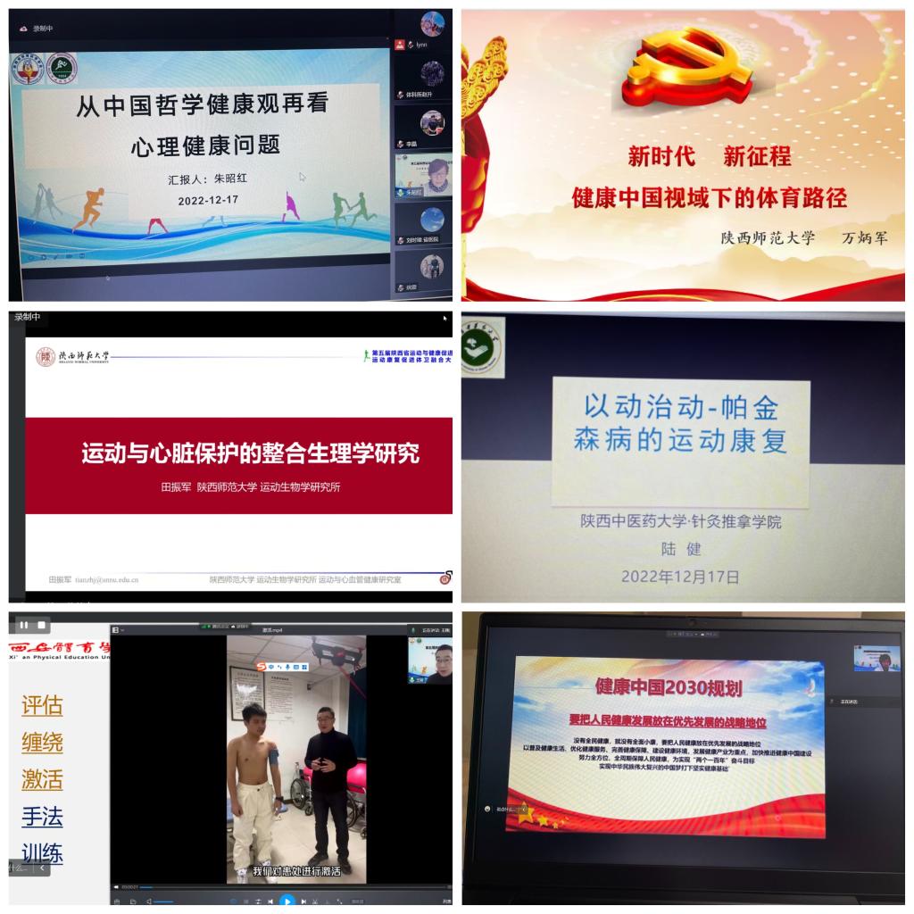 本网讯 在建设体育强国和健康中国的大背景下,为推动我省体育事业高质量发展,助力健康陕西建设,近日,第五届陕西省运动与健康促进论坛在线上成功举办。我校副校长谢英、陕西省体育科学研究所所长高治国、陕西省体育科学学会秘书长赵升、教务处处长张葆欣以及运动与健康科学学院党委书记刘勇、院长刘涛等出席会议。来自陕西师范大学、陕西省康复医院、空军军医大学西京医院、陕西省人民医院、西安市红会医院、陕西中医药大学、陕西省体科所、西安体育学院的11名专家从不同方面、围绕本次会议主题“运动康复促进体卫融合大发展”做了精彩的报告。本次论坛由陕西省体育科学学会和西安体育学院主办,我校运动与健康科学学院承办。