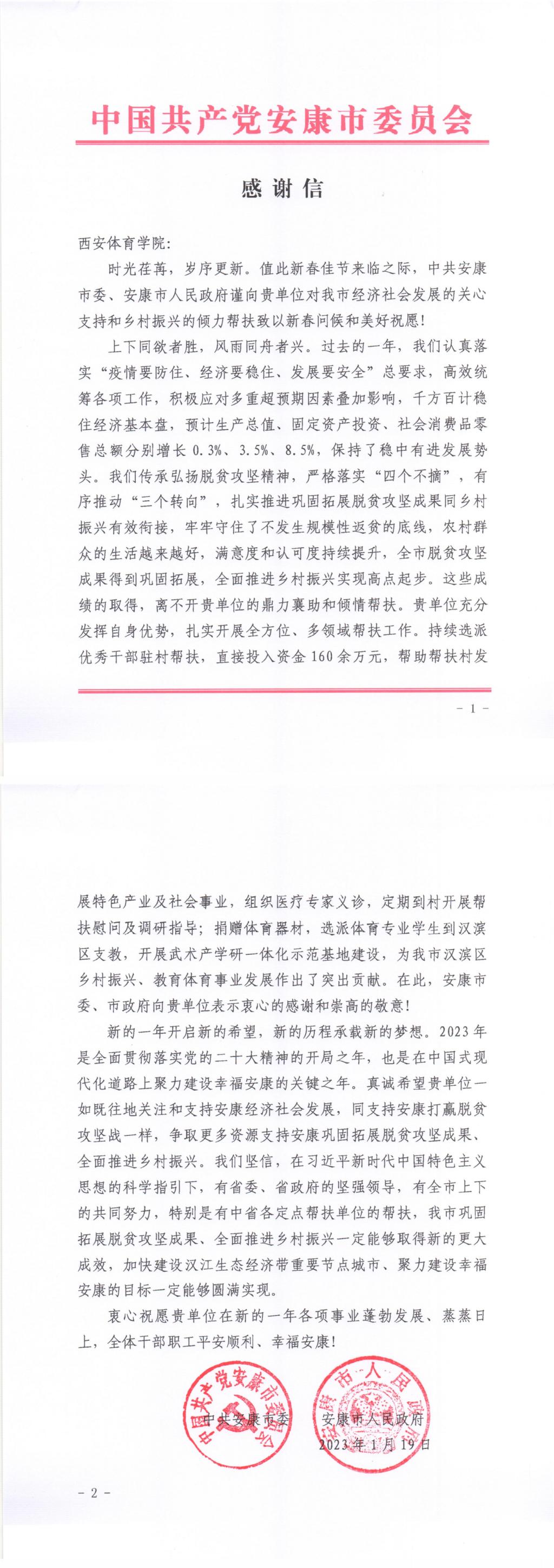 本网讯 近日,安康市委市政府致信,对我校长期以来发挥自身特色优势,对安康市扎实开展全方位、多领域帮扶工作,关心安康市乡村振兴、教育体育事业发展表示真挚感谢。