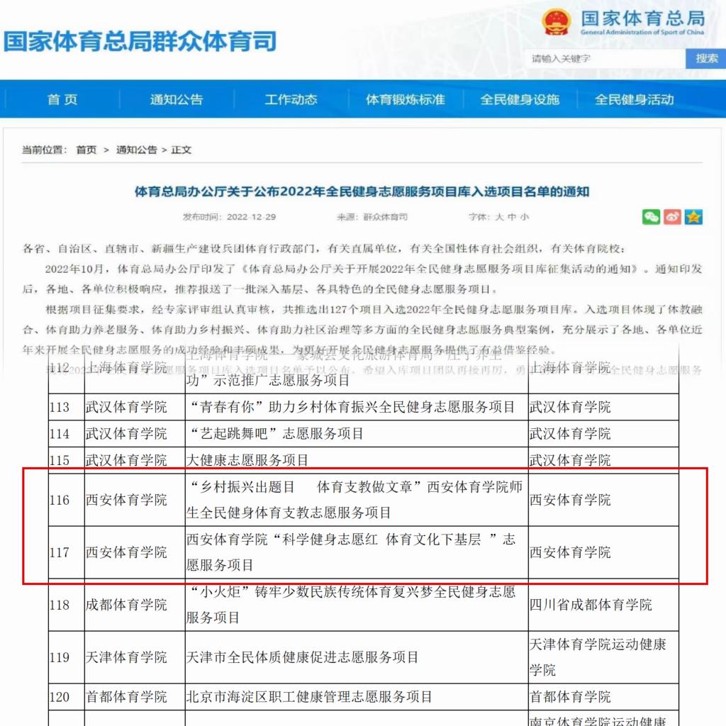 本网讯 近日,国家体育总局办公厅下发文件,公布了入选2022年全民健身志愿服务项目库的项目名单。我校两项全民健身志愿服务项目成功入选。