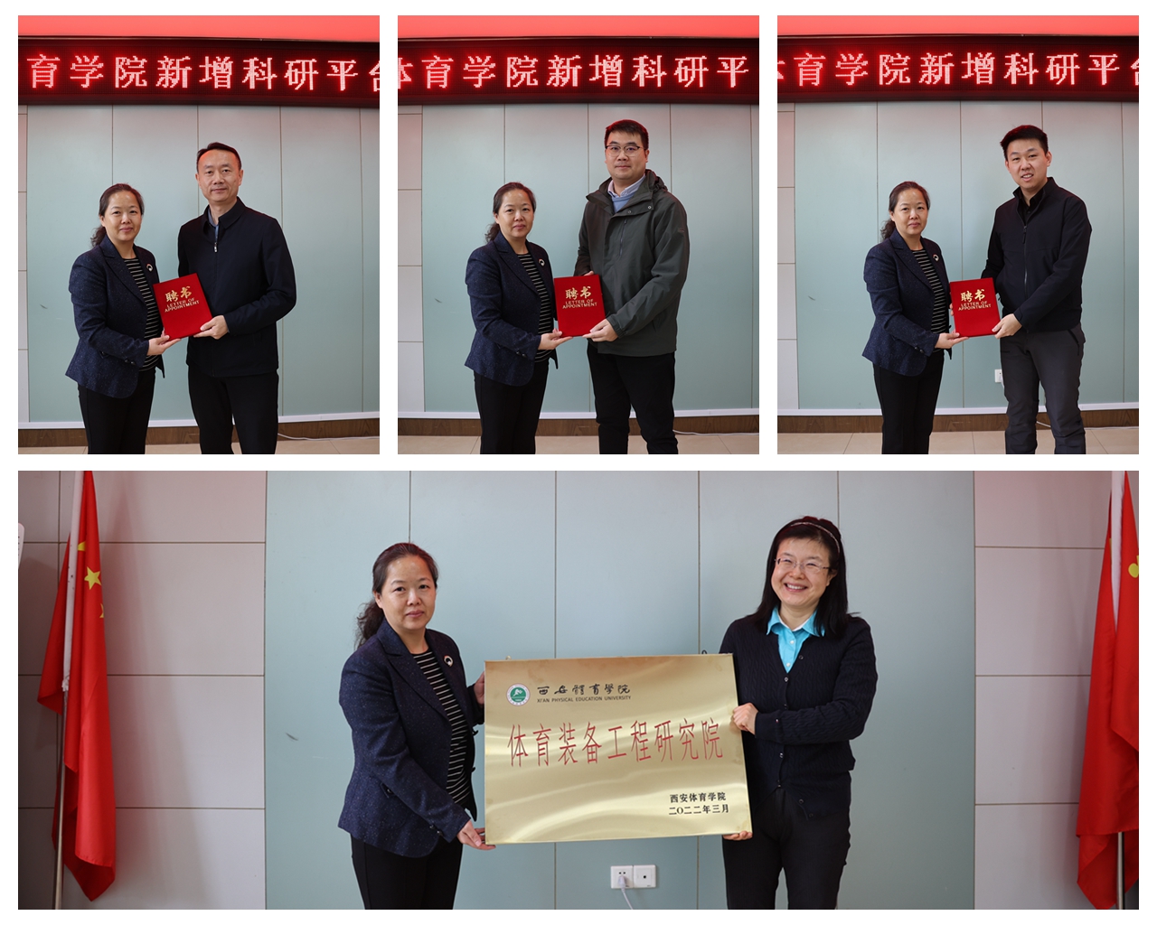 刘子实为苟波颁发“国家体育总局科普基地负责人”聘书,为潘玮敏颁发“陕西省高校工程研究中心主任”和“西安体育学院体育工程装备研究院执行院长”聘书。谢英为陕西省高校工程研究中心技术委员会主任王刚、副主任马海涛、杨少毅、穆鹏远和发展委员会主任刘涛颁发聘书,并为“西安体育学院体育工程装备研究院”揭牌。