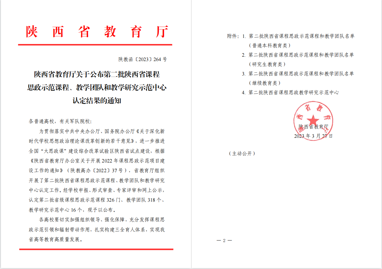 本网讯 近日,陕西省教育厅公布第二批陕西省课程思政示范课程、教学团队、教学研究示范中心名单,我校《运动生理学》、《体育新闻采访》、《音乐鉴赏》、《大学计算机基础》和《体育测量和评价》5项课程入选省级课程思政示范课程和教学团队(普通本科教育类)。