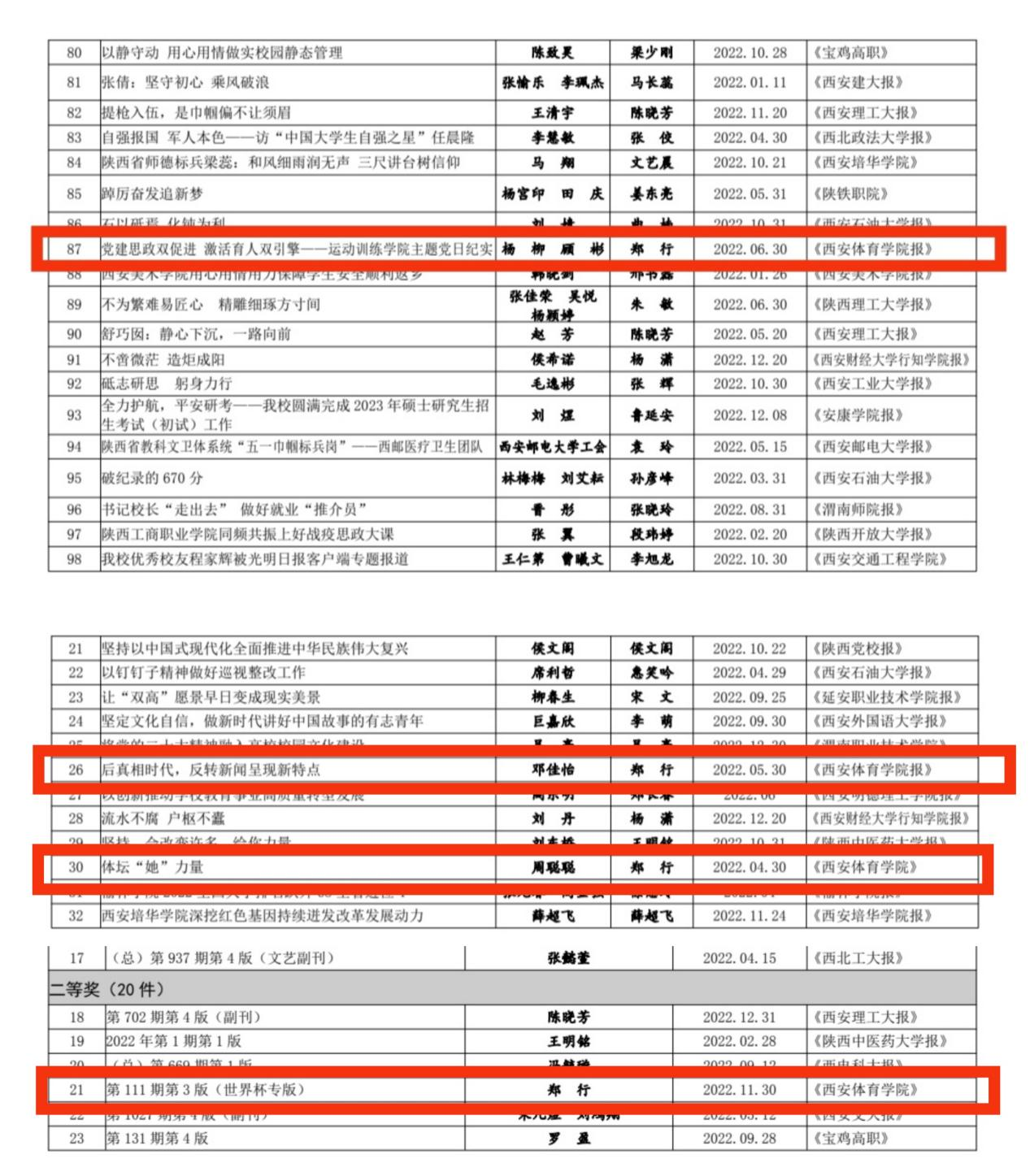 本网讯 近日,2022年度“陕西高校新闻奖”评选结果揭晓。我校共4件作品获奖。其中杨柳、顾彬采写的《党建思政双促进,激活育人新引擎——运动训练学院主题党日纪实》获通讯类二等奖;邓佳怡撰写的《后真相时代,反转新闻呈现新特点》后真相时代,反转新闻呈现新特点获言论类二等奖;周聪聪撰写的《体坛“她”力量》体坛“她”力量获言论类二等奖;雷天纵、周聪、郑行撰文,郑行编辑的《第111期第3版(世界杯专版)》第111期第3版(世界杯专版)获版面类二等奖。