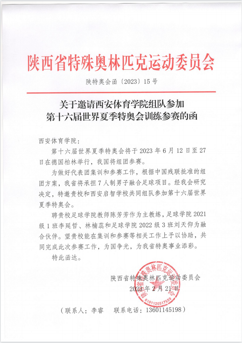 2023年2月春季新学期伊始,我校就收到了陕西特奥委员会的邀请函,鉴于我校在全省特殊教育、足球项目教学训练的广泛影响,经中国残联批准,特聘请我校足球学院教师陈芳芳担任主教练,2021级学生李延哲、林楠蕊,2022级学生刘天仰作为3名融合队员与西安启智学校6名学生共同组成7人制男子融合足球队,代表中国参加今年6月在德国柏林举行的第16届世界夏季特奥会,这在西体尚属首次,是西体人的荣耀,更是使命。