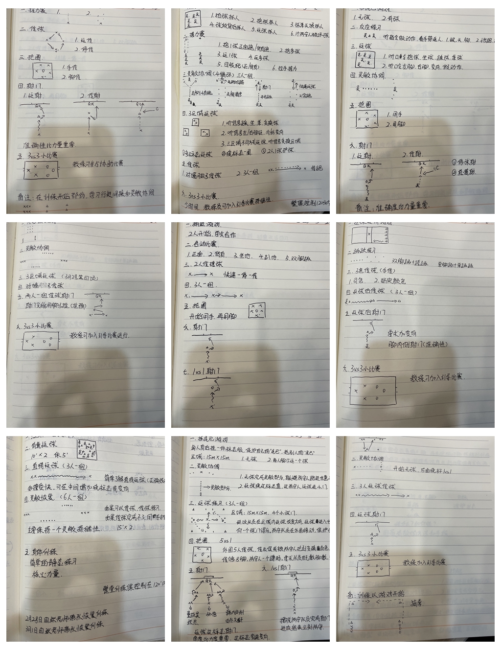 每天为融合队授课结束,她都会认真思考当天的教学,然后再制定不同阶段的训练内容、游戏内容,从她给笔者展示的手绘教案可以看出,如接力赛、九宫格游戏、捕鱼游戏、射门游戏、抢圈游戏、区域运球、跳跃训练、灵敏性训练等等。她说,“这些都是有目的、活跃气氛的训练,能让队员提高自主思考判断能力和身体协调性反应,寓教于乐。”从这一页页字迹工整的手绘教案中笔者真心感受到了陈芳芳一直坚持的用心传技、快乐教学。