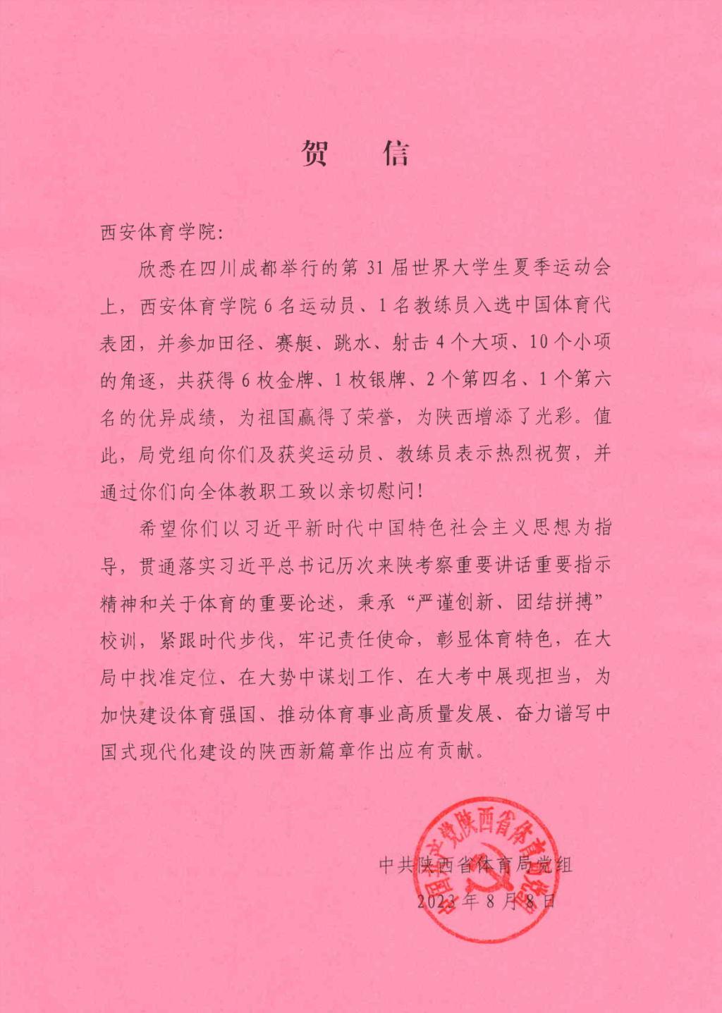 世界大学生夏季运动会,不仅是学生运动员参与的全球最大综合性体育赛事,也是规模仅次于奥运会的世界综合性运动会。赛后,陕西省体育局发来贺信,对我校学子在世界大赛中为祖国赢得荣誉、为陕西增添光彩的优异成绩表示祝贺,对获奖运动员、教练员致以亲切问候。