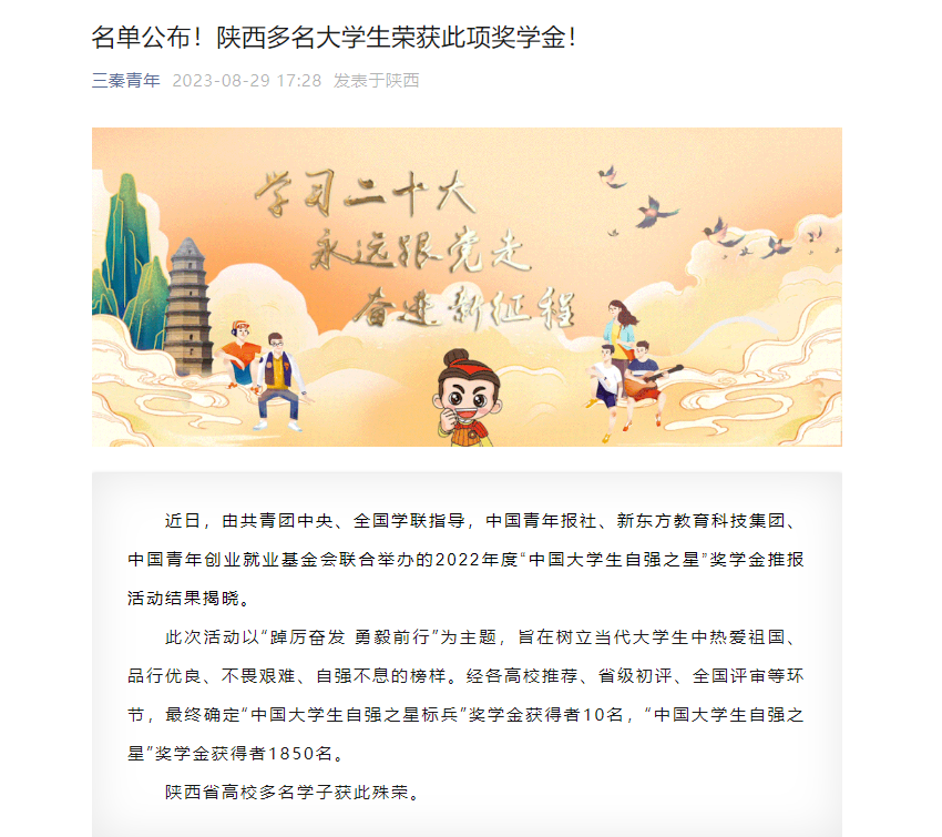 本网讯 近日,由共青团中央、全国学联指导,中国青年报社、新东方教育科技集团、中国青年创业就业基金会联合举办的2022年度“中国大学生自强之星”奖学金推报活动结果揭晓。