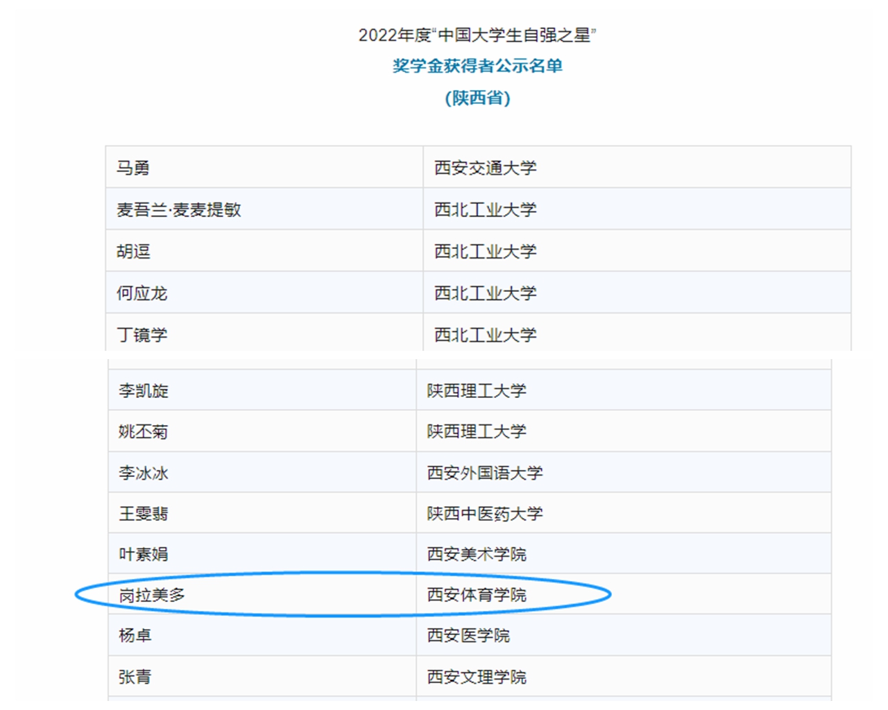 我校运动训练学院2022级学生、竞走国家健将岗拉美多荣获2022年度“中国大学生自强之星”奖学金。岗拉美多是一名来自青海的藏族学生,2017年入选西安体育学院竞走队,曾多次代表国家、陕西省参加5公里和10公里竞走比赛,在全国女子竞走总排名第二。2021年在黄山全国竞走锦标赛上取得10km冠军,刷新个人最好成绩并达到10公里健将,同时入选2021年9月20日第十四届全国运动会,代表陕西取得了女子团体20公里冠军。2021年12月入选国家队集训备战2022年阿曼世界杯竞走比赛,2022年3月代表国家出战阿曼马斯喀特比赛,获得女子10公里团体世界冠军。