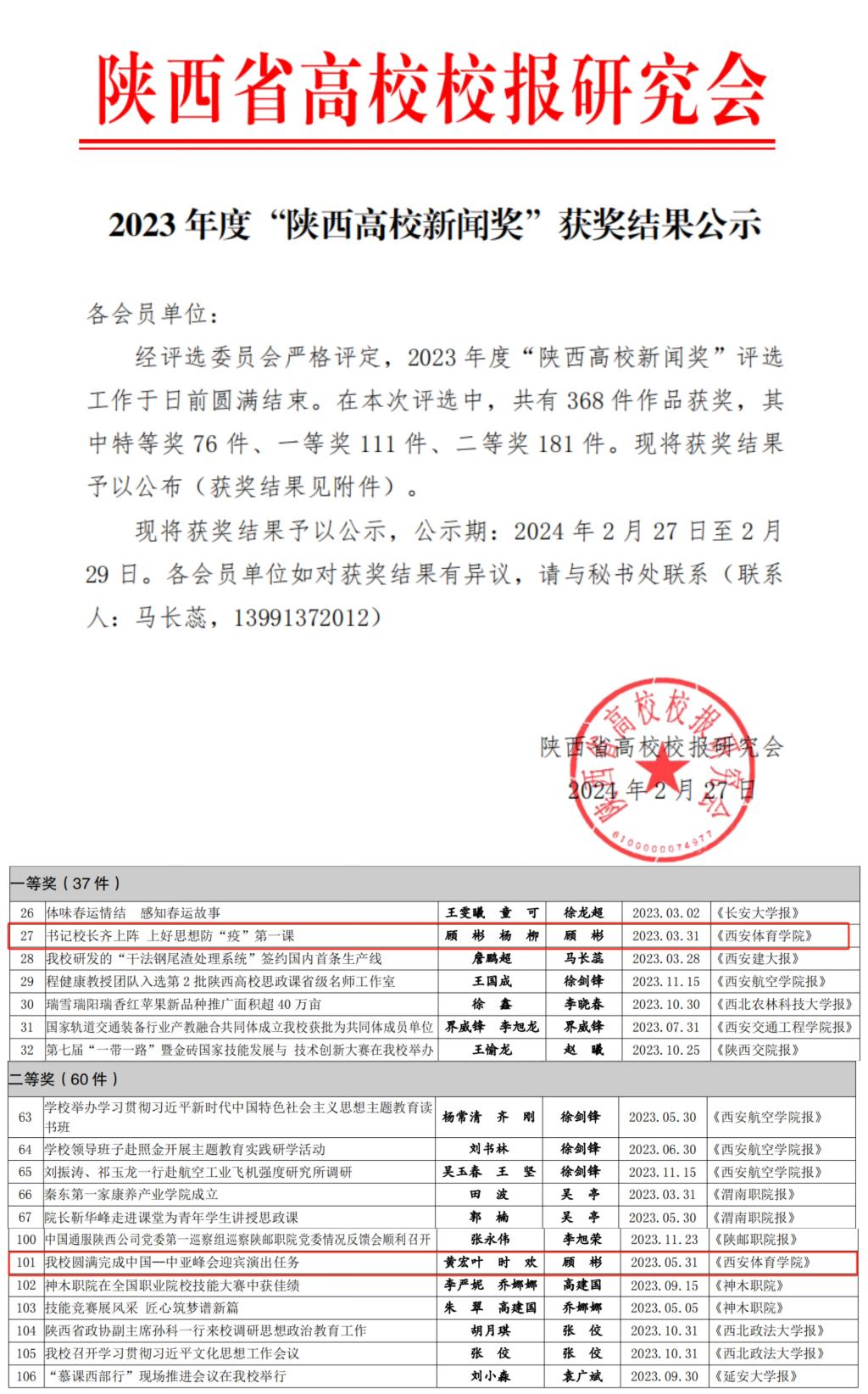 本网讯 日前,陕西高校校报协会公布了2023年度“陕西高校新闻奖”评选结果,我校2件作品榜上有名,顾彬、杨柳撰写的《书记校长齐上阵上好思想防“疫”第一课》获得一等奖,黄宏叶、时欢撰写的《我校圆满完成中国—中亚峰会迎宾演出任务》获得二等奖。
