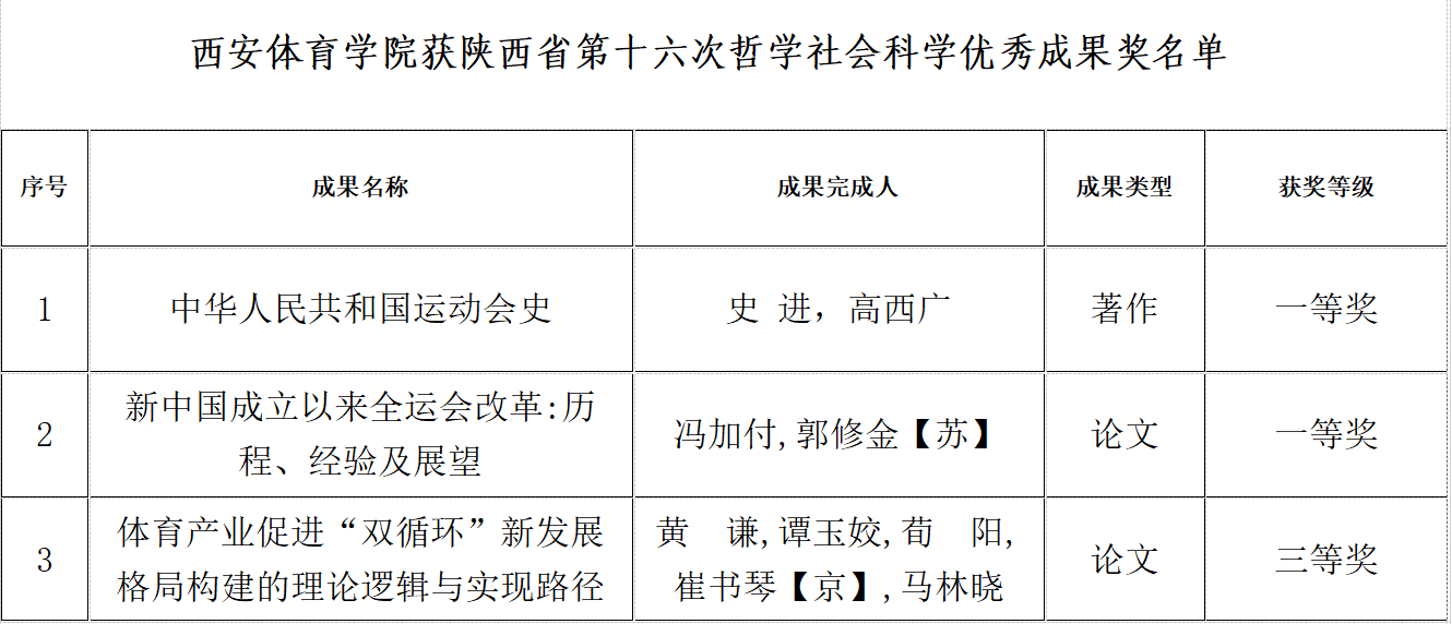 另悉,陕西省人民政府发布“关于表彰第十六次哲学社会科学优秀成果的通报”,我校共三项优秀成果获奖。史进,高西广完成的“中华人民共和国运动会史”获著作类一等奖;冯加付、郭修金完成的“新中国成立以来全运会改革:历程、经验及展望”获论文类一等奖;黄谦、谭玉姣、荀阳、崔书琴、马林晓完成的“体育产业促进“双循环”新发展格局构建的理论逻辑与实现路径”获论文类三等奖。