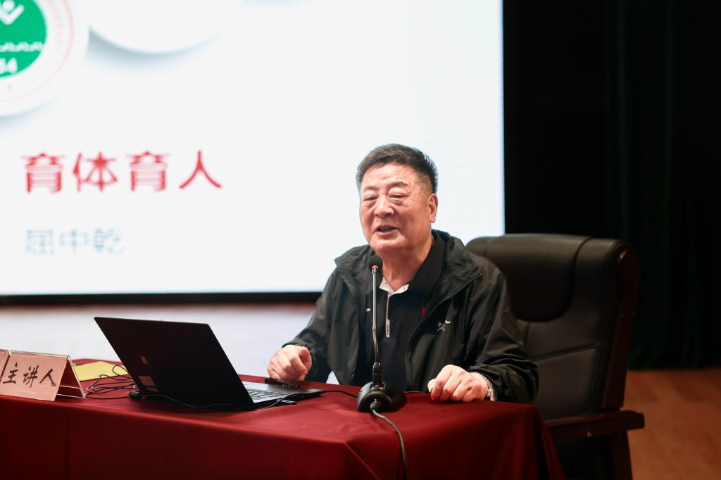 屈中乾校友从个人成长经历、工作业绩、科研成果、人才培养四个方面回顾总结了自己从热爱体育、选择西体到躬耕体育教育事业、以体育人的丰富经历和宝贵经验。他深情地表示:“母校西体,是我成长的摇篮,也是我体育教育梦想的发源地。母校的严谨治学、创新精神、开放包容、团结拼搏,深深地影响了我,让我在成长的道路上更加坚定和自信。感谢母校的辛勤栽培,能够在建校70周年之际受邀回到母校,为师生分享自己的教育教学心得,倍感亲切,十分荣幸。” “40多年的教学生涯,我和我的教学团队取得了很多荣誉,现在我仍然坚守一线,把青春和汗水奉献给了体育,最骄傲的一点是——我没有给母校丢脸!”希望同学们牢记“严谨 创新 团结 拼搏”的校训,发扬“诚厚俭朴 勤奋刻苦 团结拼搏 求实创新 爱国荣校”的西体精神,牢记体育人的光荣使命,珍惜学习机会,学会做人做事,精进专业技能,增强实践能力,实现体育梦想。最后,他祝福母校明天更美好,培养出更多优秀的体育人才!