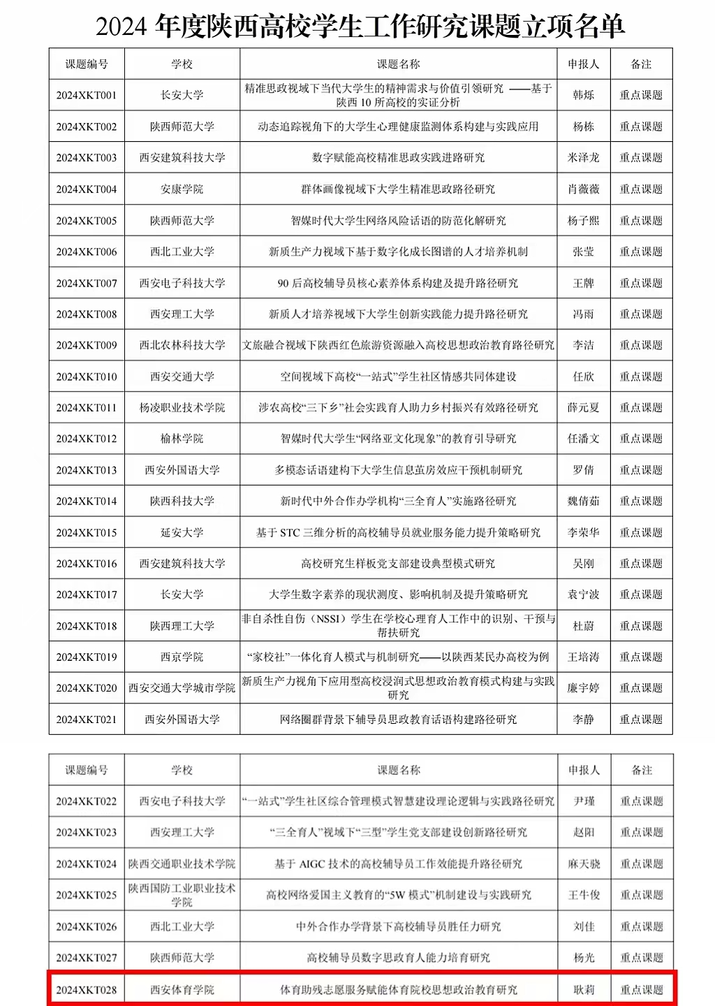 本网讯 近日,陕西省委教育工委公布了《2024年度陕西省高校学生工作研究课题立项名单》,我校3项研究课题立项,其中1项为重点课题。
