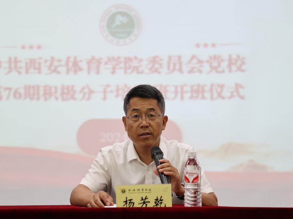 本网讯 为深入贯彻落实新时代党的建设总要求和新时代党的组织路线,切实做好入党积极分子的培养教育工作,充实党员队伍后备力量,严把发展党员“入口关”,6月17日,我校举行第76期入党积极分子培训班开班式暨首场专题报告。校党委副书记、纪委书记、监察专员杨芳乾出席并讲话,相关职能部门负责人、二级学院党组织书记、教职工入党积极分子和学生入党积极分子参加会议。