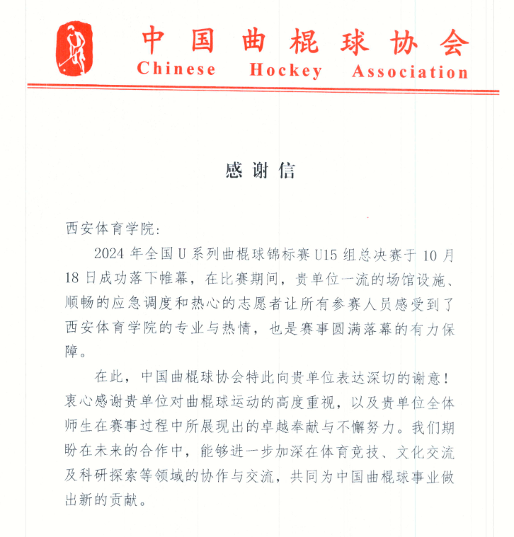 本网讯 近日,中国曲棍球协会向我校来信致谢,对我校在承办2024年全国青少年曲棍球锦标赛U15组总决赛中的专业办赛、保赛素养给予高度评价并表示感谢。