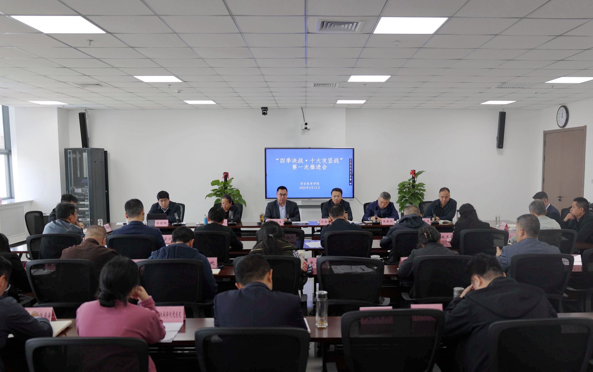 会议指出,“十大攻坚战”集结号已经奋力吹响,西体上下要形成主要校领导挂帅,分管校领导出征,处级单位攻坚的机制,凝聚思想共识,坚定必胜信念,发挥“头雁”作用,以“功成不必在我”的精神境界和“功成必定有我”的历史担当,以上率下、身体力行,按照最快速度、最高目标、最强力量、最优团队、最佳效果、最严纪律工作要求,以时间为轴、任务为刺、正排工序、倒排工期、挂图作战、压茬推进,确保各项任务落到实处,为实现“三年行动计划”既定目标,挺进体育院校第一方阵,推进学校高质量发展而努力奋斗!