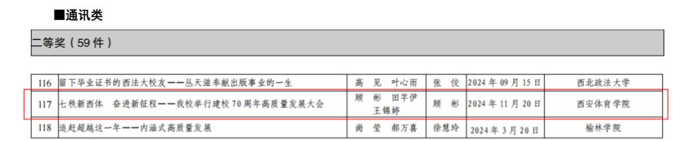 本网讯 日前,陕西高校校报研究会公布了2024年度“陕西高校新闻奖”评选结果,我校2件作品获奖。其中《〈西安体育学院报〉建校七十周年发展巡礼——追溯初心》获得版面类特等奖,顾彬、田芊伊、王锦婷撰写的《七秩新西体 奋进新征程——我校举行建校七十周年高质量发展大会》获得通讯类二等奖。