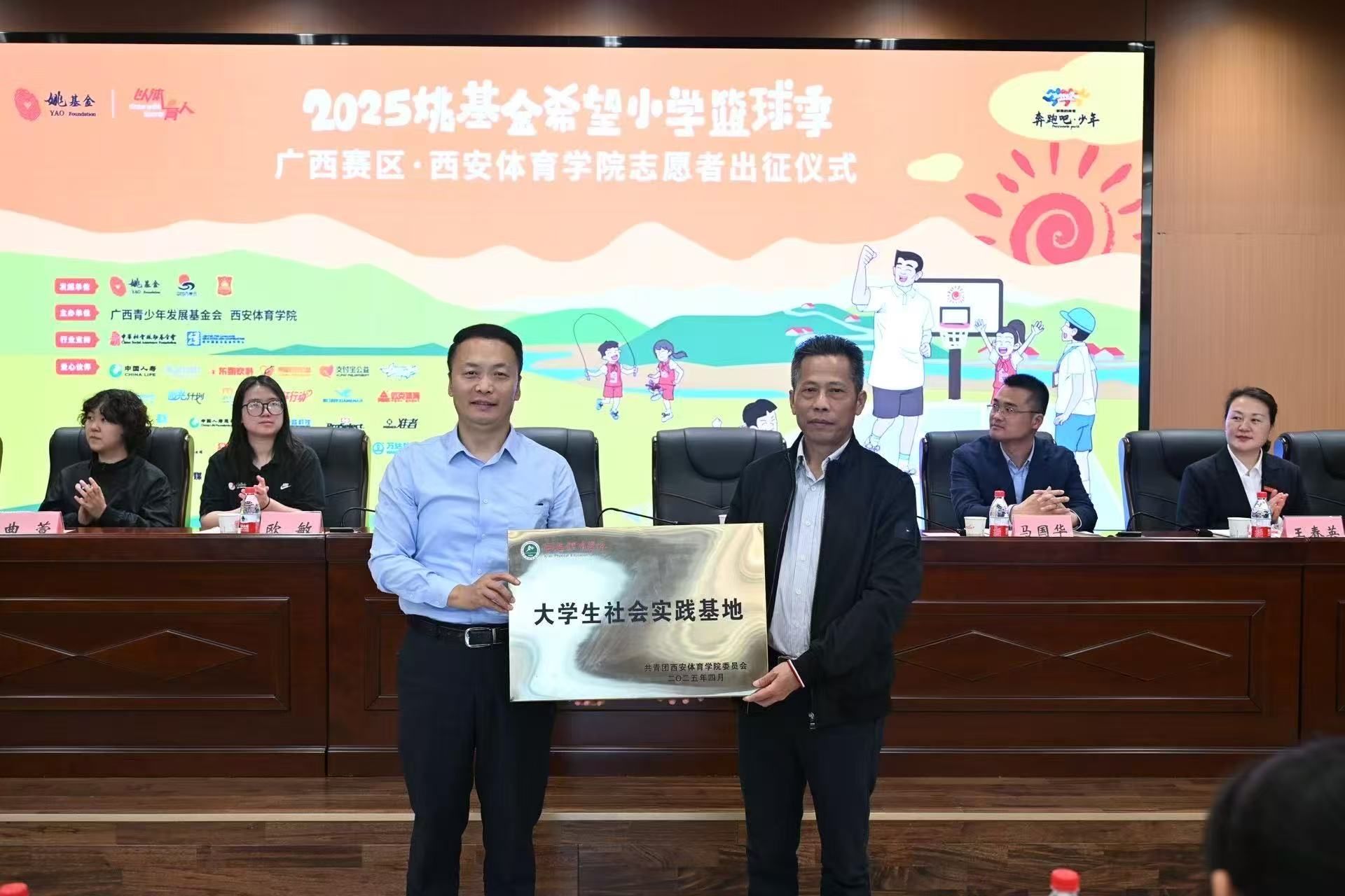 本网讯 4 月 11 日,2025年姚基金希望小学篮球季广西赛区支教志愿者出征仪式在我校鄠邑校区举行。党委副书记马海涛、北京姚基金公益基金会项目主管欧敏、广西青少年发展基金会副理事长黎传文出席,校内相关职能部门、二级学院负责人及辅导员、篮球支教培训教师以及2025 年姚基金支教志愿者参加仪式。