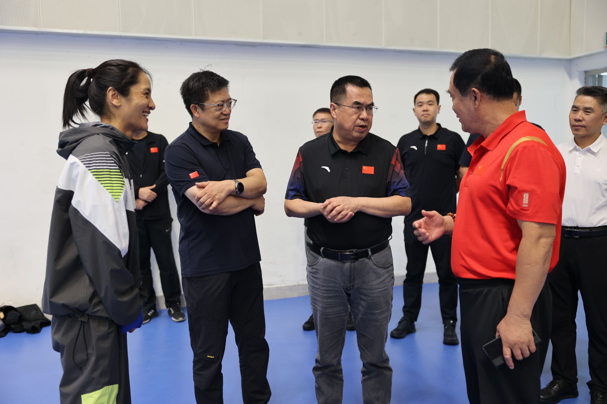 看望备战全运会的教师刘飘飘(左一)