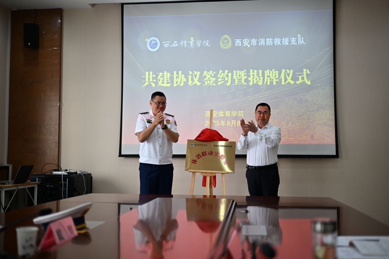 本网讯  9月8日,我校与西安市消防救援支队举行战略合作签约仪式暨“体消联动实验室”揭牌仪式。西安市消防救援支队党委副书记、支队长赵璐,支队政治部主任夏波,副支队长王昱钦出席。我校校长李富生主持会议并讲话,副校长雷振华出席。双方相关部门负责人一同参会。