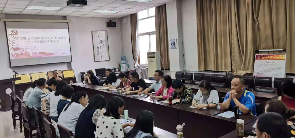 本网讯 7月5日上午9点,马克思主义学院在校图书馆三楼会议室召开了学习习近平总书记在庆祝中国共产党成立100周年大会重要讲话精神教学研讨会,会议由马克主义学院院长秋实主持,全体教师参加了研讨会。