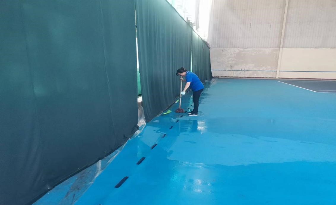 网球馆侧墙雨水漫灌进场馆,现场清扫雨水情况