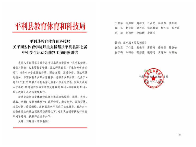 本网讯 4月26日,平利县教育体育和科技局向我校致感谢信,对我校师生在平利县第七届中小学生运动会中承担的裁判帮扶工作表达了诚挚感谢和高度认可。