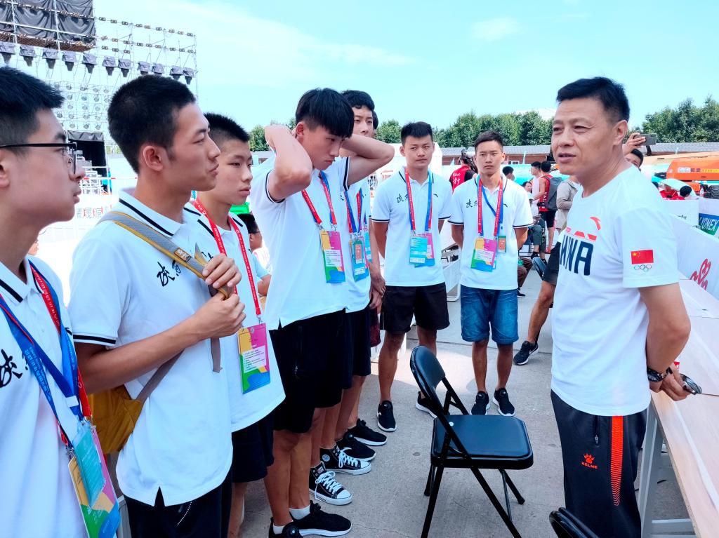 竞技体校校长张文军(右)为我校运动员加油鼓劲