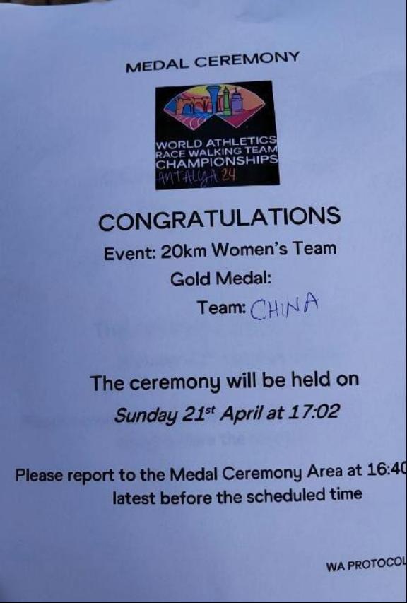 本网讯 北京时间2024年4月21日中午12点,世界竞走团体锦标赛在土耳其的安塔利亚开赛。我校女子竞走运动员殷腊梅(左一)在20公里女子团体竞走比赛中获得冠军。