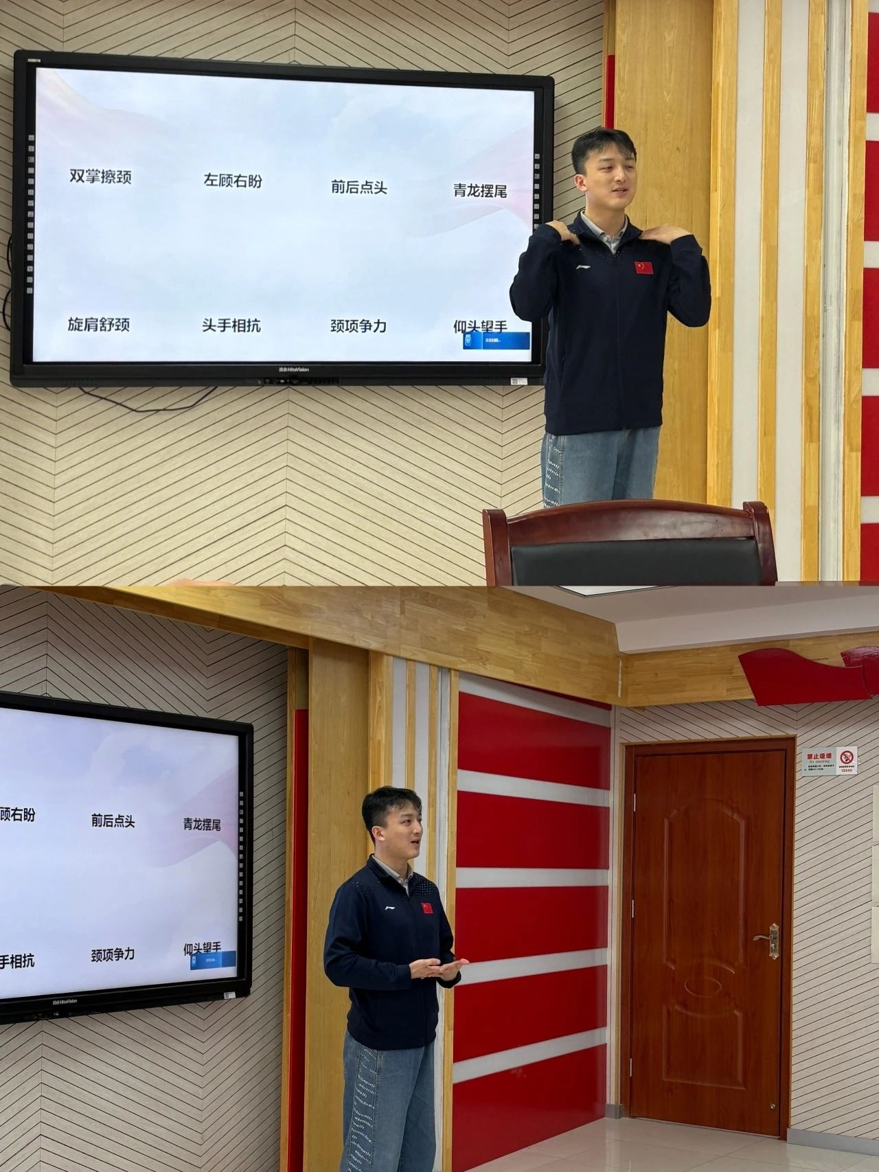 康保现任会长陈文杰、王昱彬、蔡青、商子茉在台上为老师们带来可以缓解疼痛疲劳的颈椎操,一步一步仔细讲解和演示,恢复正常人体颈椎的生理曲度、促进血液和淋巴循环,缓解颈部肌肉僵硬,老师和同学们纷纷积极配合,事后也表示效果显著!