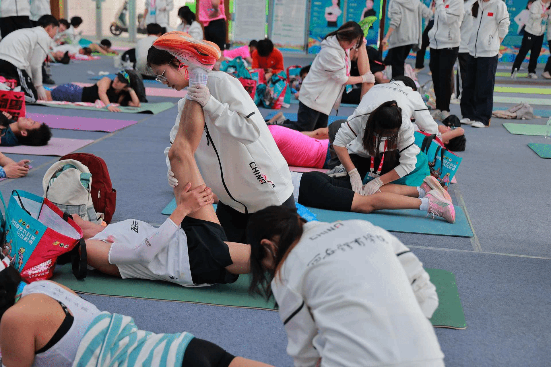 本次马拉松赛后,运动与健康科学学院志愿者中的康保团队为全体半程马拉松参赛选手提供了全面而细致的赛后拉伸按摩及康复理疗服务。他们针对跑步过程中易受累的腿部、腰背等肌群,运用科学的拉伸手法,深入缓解肌肉紧绷与酸痛,帮助选手们快速恢复体力。