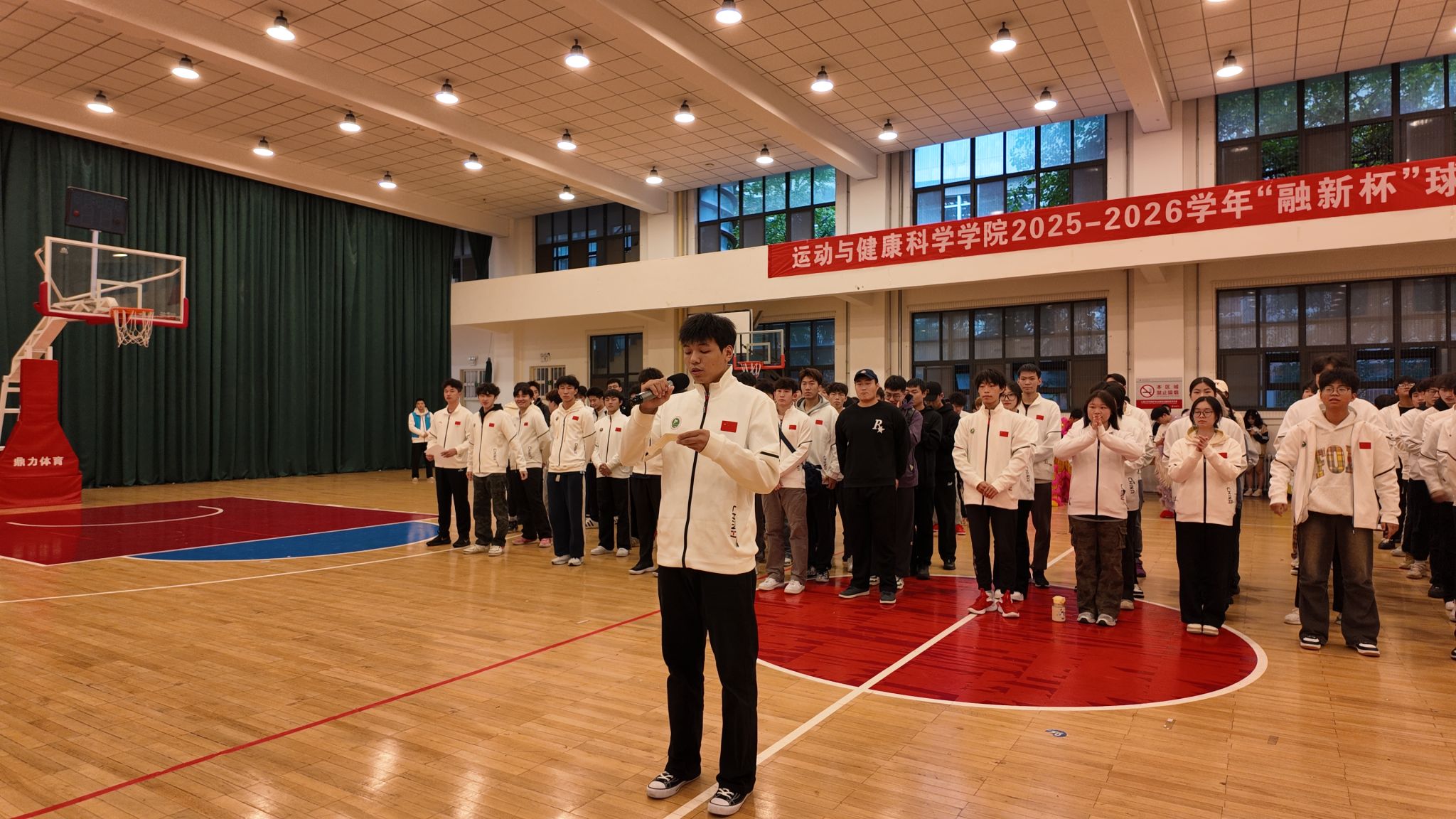 随后,运动与健康科学学院党委书记张鹏华郑重宣布:“融新杯”正式开赛!全场掌声雷动,欢呼不断,青春的赛场正式被点燃。