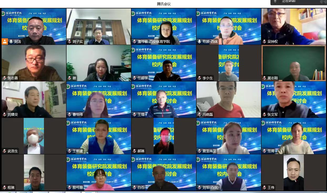 2022年10月26日晚19:00时,由运动与健康科学学院主办,体育装备工程研究院承办的“西安体育学院体育装备工程研究院发展规划校内研讨会”以线上形式正式举行。会议邀请了校长刘子实,副校长谢英和相关职能部门的负责人以及校内专家和体育装备工程研究院骨干人员共计三十余人进行了交流。会议由运动与健康科学学院刘涛院长主持。