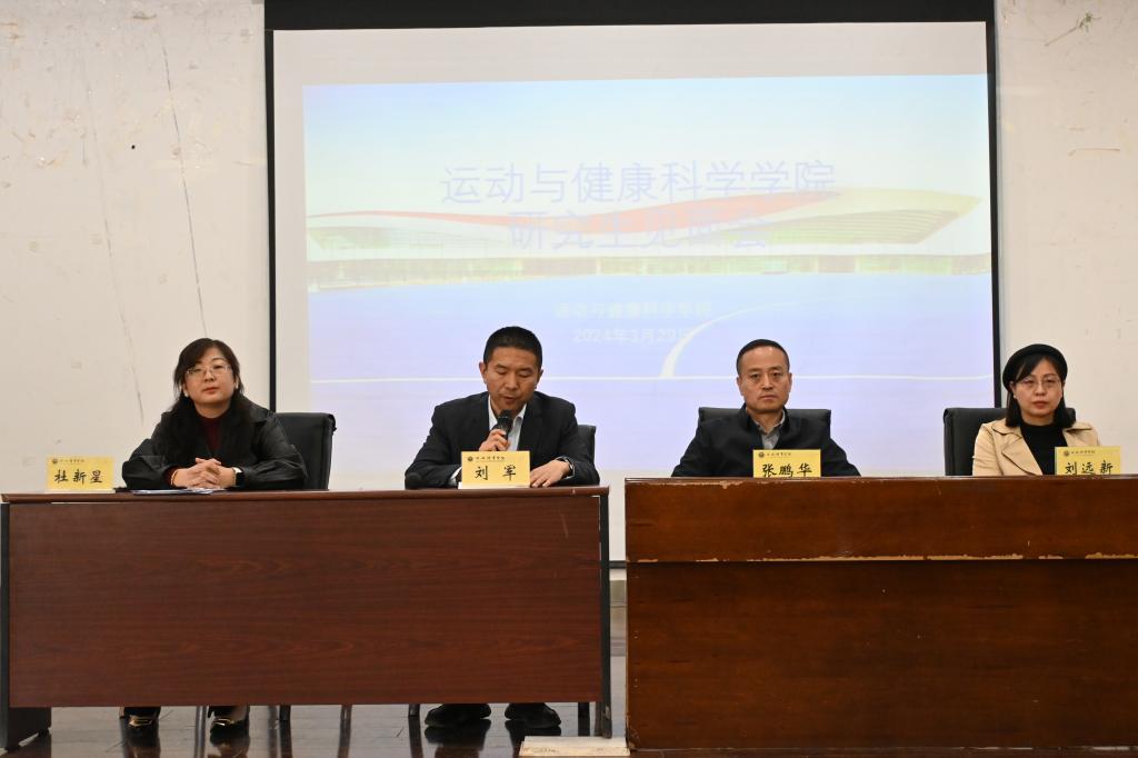 根据我校“十大改革发展工程”学科建设工程中研究生教育校院两级管理工作实施精神,2024年3月29日中午,运动与健康科学学院在教学楼五楼报告厅召开学院研究生见面会。学院班子成员、学院全体研究生导师、各教研室主任、支部书记、科以上干部、近三年新进博士、学院全体研究生参加了会议。会议由运动与健康科学学院副院长杜新星主持。