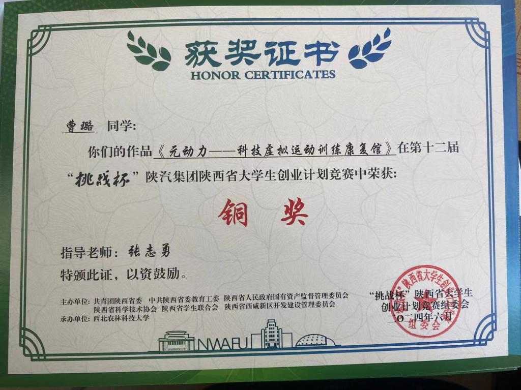 6月7日举行的第十二届“挑战杯”陕汽集团陕西省大学生创业计划竞赛在西北农林科技大学落下帷幕。我院张志勇老师指导的本科生曹璐同学的作品“元动力——科技虚拟运动训练康复馆”获得本届陕西省“挑战杯”大学生创业计划竞赛“铜奖”。