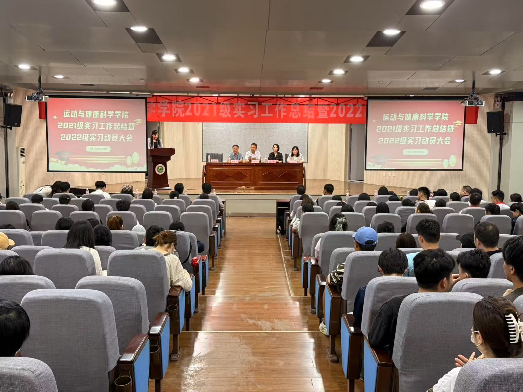 为切实保障学院实习工作的有序推进,5月19日下午,运动与健康科学学院在教学楼一楼报告厅召开了2021级实习工作总结暨2022级实习动员大会,学院班子领导成员、校内外实习指导教师代表、全体专兼职辅导员以及2021级和2022级学生参加了此次会议。会议由杜新星副院长主持。