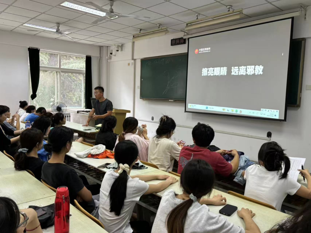 2023级学生干部郭永乐鼓励同学分享对邪教的看法,讨论如何防范和抵制邪教,提高自身科学素养、增强辨识能力、拒绝邪教组织的诱惑等。树立正确的世界观、人生观和价值观。