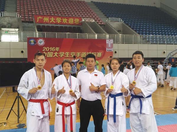 十月的羊城,秋高气爽。2016年全国大学生空手道锦标赛于10月11日在广州大学体育馆拉开帷幕,本次比赛共有来自全国30所大学300余名运动员参赛。经过三天的鏖战,我院大学生空手道代表队成功卫冕男子团体组手冠军,同时在男子B组组手-75公斤级、男子B组组手+79公斤级、女子B组组手-49公斤级、女子C组组手-61公斤级分获冠军,男子B组组手+79公斤级、女子B组组手-49公斤级冠军的获得是该项目新的突破。本届比赛,我院共取得了5金6银4铜,奖牌和团体总分第一名的辉煌成绩,并获得“体育道德风尚奖”,为学院赢得了荣誉。在空手道项目已列入2020年东京奥运会比赛项目的历史时刻,此次比赛意义深远!