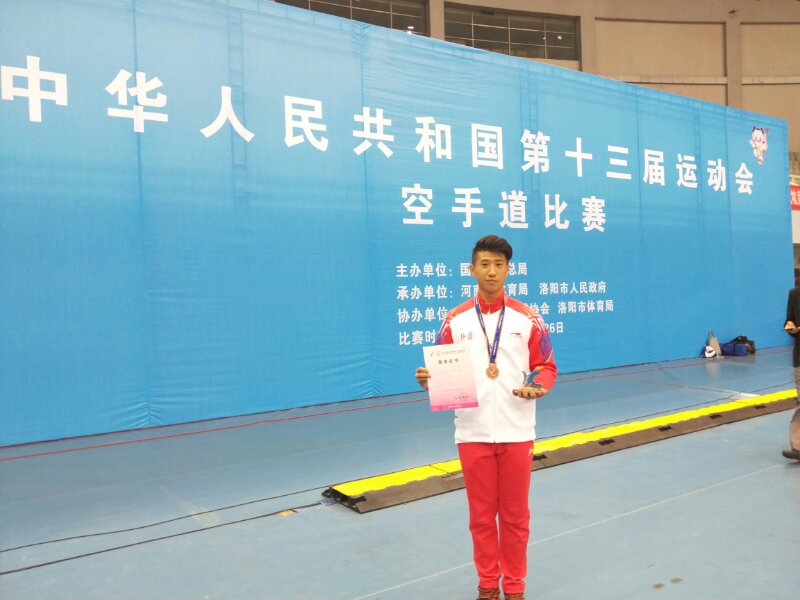 第十三届全运会空手道项目的比赛于8月26日在洛阳圆满地落下帷幕。在为期3天的比赛中,我院学生顽强拼搏,其中运动训练系2014级学生寇赢获得竞技阻手男子负75公斤级第三名,运动训练系2015级学生祁凡丁获得竞技阻手女子61公斤级第五名的好成绩,教练员马波获得体育道德风尚奖。