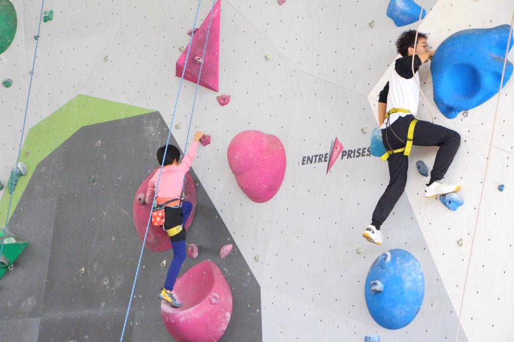 攀石场地上,在教练员和裁判员的引领指导下,运动员们穿戴好保护装置开始了激烈的比赛。速度道上,运动员们接收到发令信号后迅速攀上墙面,在气氛组和观众的欢呼声中向两边赛道极速攀爬冲刺,实力不分伯仲。另一边的难度赛道上,运动员的一举一动牵动着观众的心,惊叫声欢呼声此起彼伏。