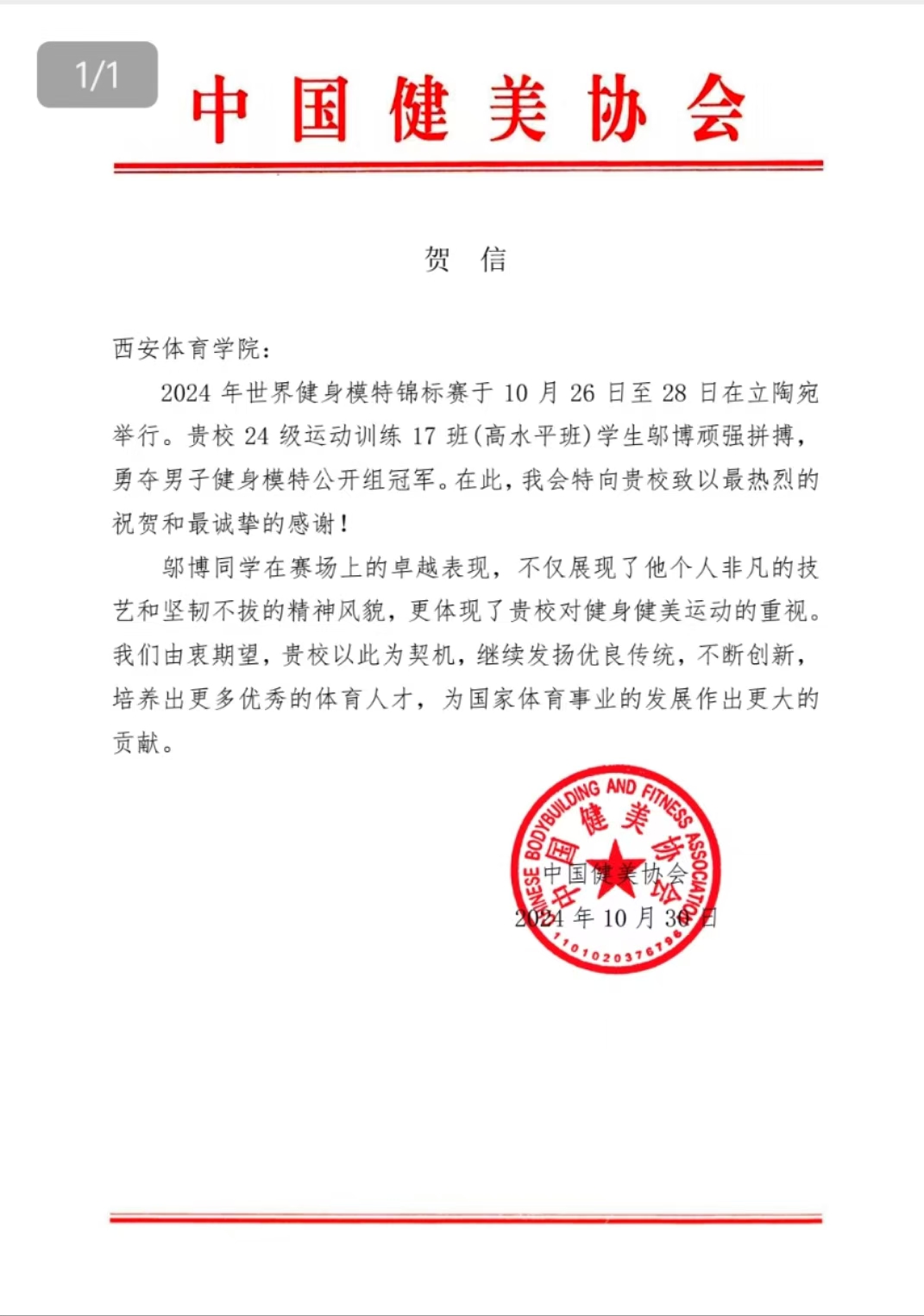 中国健美协会向我校发来贺信